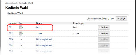 Klicken Sie auf [Nummer], [Typ] oder [Name] des Empfängers, für den Sie eine Zugriffseinschränkung einstellen möchten.