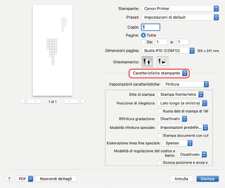 Dal menu a comparsa delle opzioni di stampa, selezionare [Caratteristiche stampante].