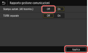 Selezionare <Off> in <Stampa autom. (40 trasmiss.)> e selezionare <Applica>.