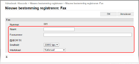 Geef bij het opslaan van internationale faxnummers [Internationaal (1)] tot [Internationaal (3)] op, al naar gelang de verzendomstandigheden.