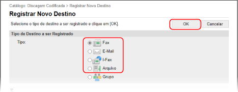 Selecione o tipo de destino a registar e clique em [OK].