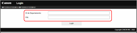 Introduza o [ID de Departamento] registado e [PIN] e, em seguida, clique em [Login].