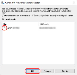 Kun laite yhdistetään tietokoneeseen langattoman tai langallisen lähiverkon kautta, rekisteröi laite MF Network Scanner Selector -ohjelmistoon.