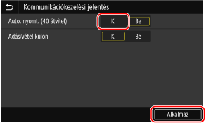 Válassza a <Ki> lehetőséget az <Auto. nyomt. (40 átvitel)> pontnál, majd válassza a <Alkalmaz> lehetőséget.