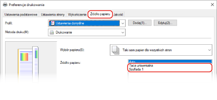 Na karcie [Źródło papieru], wybierz źródło papieru, do którego załadowany jest papier wstępnie zadrukowany [Źródło papieru].