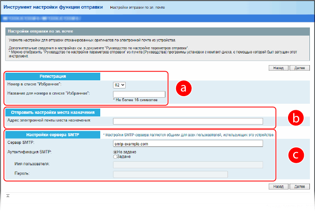 Используйте специальный инструмент настройки (Инструмент настройки функции отправки) через веб-браузер, установленный на аппарате.