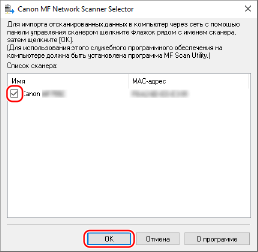 При подключении аппарата к компьютеру через беспроводную или проводную локальную сеть зарегистрируйте аппарат в «MF Network Scanner Selector».