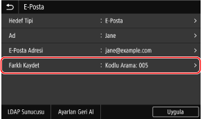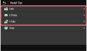 Kaydedilecek hedef türüne bağlı olarak <Faks Numarası>, <E-Posta Adresi> veya <I-Faks Adresi> öğesini seçin.