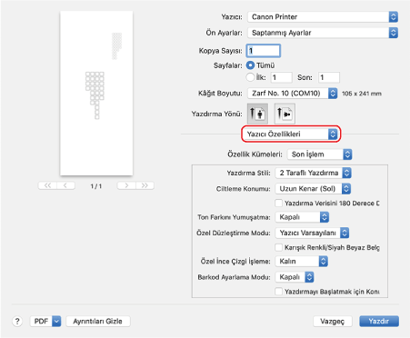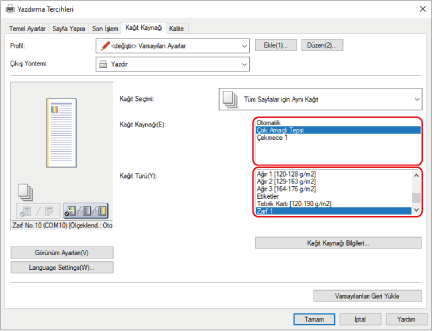 [Özellik Kümeleri] kısmında [Kağıt Kaynağı] öğesini ve ardından [Kağıt Türü] kısmında [Zarf 1] veya [Zarf 2] öğesini seçin.