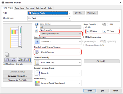 [Temel Ayarlar] sekmesinde kağıt boyutunu, yazdırma yönünü ve yazdırılan yüzleri belirtin.