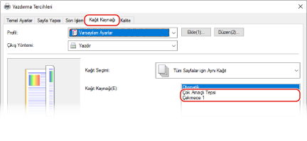 [Kağıt Kaynağı] sekmesinde, önceden basılı kağıdın [Kağıt Kaynağı] kısmında yüklendiği kağıt kaynağını seçin.