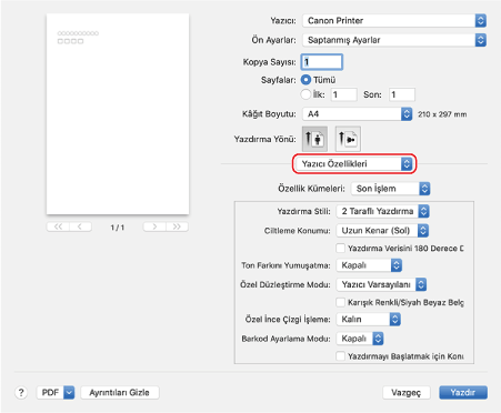 [Özellik Kümeleri] kısmında [Son İşlem] öğesini ve ardından [Yazdırma Stili] kısmında [1 Taraflı Yazdırma] veya [2 Taraflı Yazdırma] öğesini seçin.