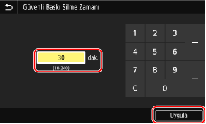Güvenli bir belgenin bellekte saklanacağı süreyi değiştirin ve ardından <Uygula> öğesini seçin.