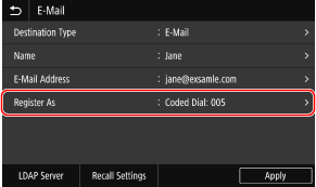 בהתאמה לסוג היעד לרישום, בחר <Fax Number>, <E-Mail Address>, או <I-Fax Address>.