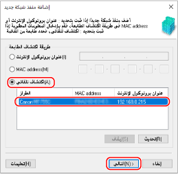حدد [اكتشاف تلقائي]، وحدد الجهاز عندما يظهر، ثم انقر فوق [التالي].