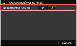 Εάν θέλετε να συμπεριληφθεί μέρος του απεσταλμένου πρωτοτύπου στην αναφορά αποτελέσματος αποστολής, επιλέξτε <On> για την επιλογή <Να συμπεριληφθεί εικόνα ΑΠ>.