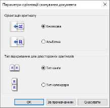 Клацніть [Параметри орієнтації сканування документа] і налаштуйте напрямок сканування оригіналу, розташованого в подавачі. Не можна змінити напрямок сканування для оригіналу, розташованого на склі експонування.