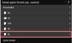 Lorsque des enveloppes sont chargées dans le bac multifonctions, l'écran de réglages pour sélectionner le format du papier s'affiche. Suivez les étapes ci-dessous pour spécifier les réglages.