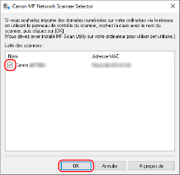 Lorsque vous connectez la machine à un ordinateur via un réseau local sans fil ou un réseau local câblé, enregistrez la machine dans "MF Network Scanner Selector".