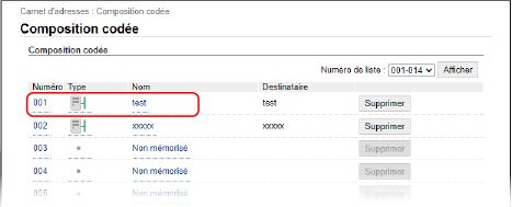 Cliquez sur [Numéro], [Type] ou [Nom] de la destination pour laquelle vous souhaitez fixer une restriction d'accès.