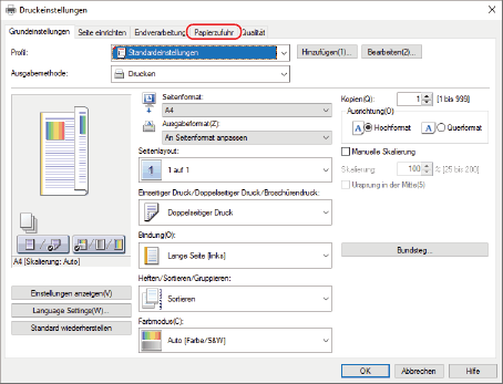 Klicken Sie im Druckeinstellungsfenster des Druckertreibers auf [Papierzufuhr].