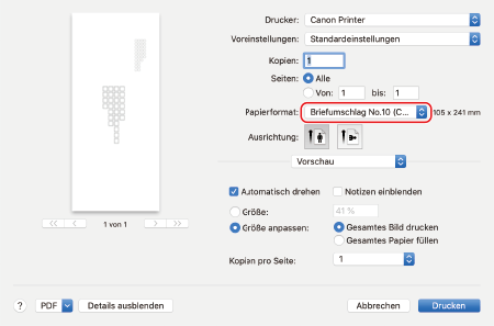Wählen Sie das Papierformat der eingelegten Briefumschläge unter [Papierformat] aus.