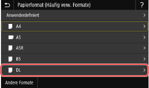 Wenn Briefumschläge in das Mehrzweckfach eingelegt werden, wird auf dem Display der Einstellungsbildschirm für die Auswahl des Papierformats angezeigt. Folgen Sie den unten aufgeführten Schritten, um die Einstellungen anzugeben.