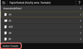 Wenn das Papierformat des eingelegten Papiers nicht angezeigt wird, wählen Sie <Andere Formate> aus.