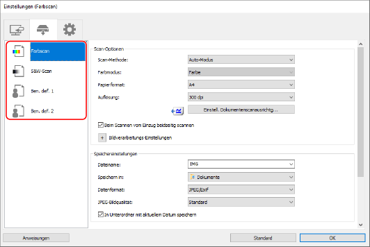 Sie können häufig verwendete Scaneinstellungen unter [Ben. def. 1] und [Ben. def. 2] registrieren.