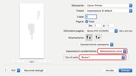 Selezionare <Busta>/<Busta 1> per il tipo di carta.