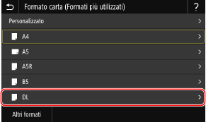 Quando le buste sono caricate nel vassoio multiuso, sul display viene visualizzata la schermata di impostazione per selezionare il formato della carta. Seguire i passaggi di seguito per specificare le impostazioni.
