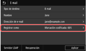 Se puede dejar <Nombre> en blanco. Sin embargo, si especifica un nombre, puede encontrar y seleccionar el destino buscando el carácter inicial del nombre especificado.