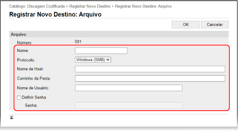 Introduza a localização da pasta para a qual os dados serão enviados. Utilize "\" como separador. Especifique o nível que segue o caminho especificado em [Nome de Host].