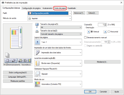 Clique em [Fonte de papel] na caixa de diálogo definições de impressão do controlador da impressora.