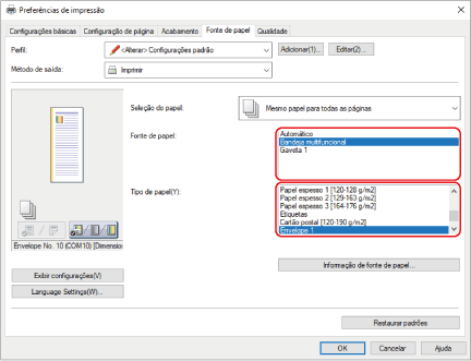 Selecione a origem de papel na qual os envelopes estão colocados em [Fonte de papel] e selecione [Envelope] em [Tipo de papel].