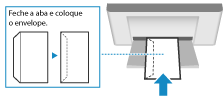 Coloque os envelopes de modo a que a extremidade com a aba fique virada para o lado esquerdo com a parte da frente (lado impresso) virada para cima.