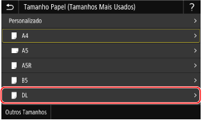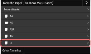 Quando os envelopes são colocados no tabuleiro multifunções, o ecrã de definições para selecionar o tamanho do papel é apresentado no visor. Siga os passos abaixo para especificar as definições.