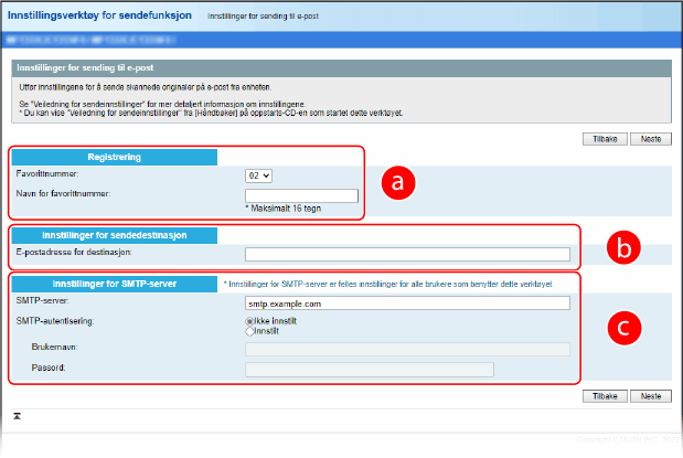 Informasjon om innstillinger for e-postserver (SMTP-servernavn*, portnummer*, godkjenningskrav, og brukernavn, passord, osv, for godkjenning)