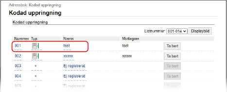 Klicka på [Nummer], [Typ] eller [Namn] för mottagaren som du vill ge begränsad åtkomst.
