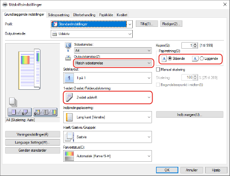 På fanen [Grundlæggende indstillinger] skal du angive papirformatet, udskrivningsretningen og de udskrevne sider.