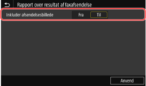 Hvis du vil inkludere en del af den transmitterede original i transmissionsresultatrapporten, skal du vælge <Til> for <Inkluder afsendelsesbillede>.