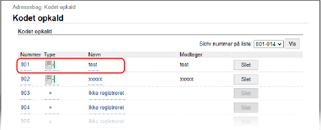 Klik på [Nummer], [Type] eller [Navn] for den destination, som du vil indstille adgangsbegrænsninger for.