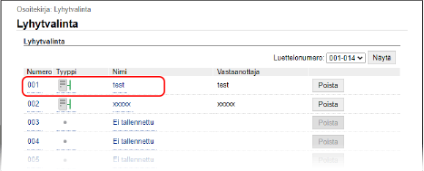 Jos haluat muokata rekisteröityä kohdetta, napsauta rekisteröitävän kohteen kohtaa [Numero], [Tyyppi] tai [Nimi], napsauta [Muokkaa] ja siirry sitten vaiheeseen 8.