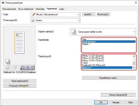 Valitse [Paper Source] kohdassa [Ominaisuusjoukot] ja valitse sitten [Envelope 1] tai [Envelope 2] kohdassa [Paper Type].