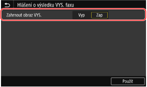 Pokud chcete zahrnout část přeneseného originálu do zprávy o výsledku přenosu, vyberte možnost <Zap> u položky <Zahrnout obraz VYS.>.