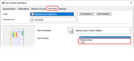 A [Papírforrás] lapon válassza ki a papírforrást, ahová az előrenyomtatott papír betöltődik a több [Papírforrás] közül.