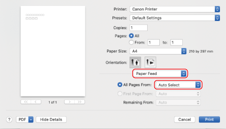 Válassza ki a [Paper Feed] lehetőséget a nyomtatási beállítások előugró menüjéből, majd válassza ki a papírforrást, ahová be van töltve az előrenyomtatott papír a [All Pages From] előugró menüből.
