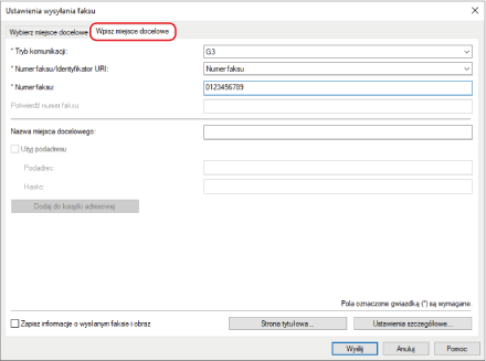 Wprowadź [Numer faksu] lub [Identyfikator URI].