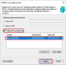 Vyberte položku [Automatické rozpoznanie], po zobrazení vyberte príslušné zariadenie a kliknite na položku [Ďalej].