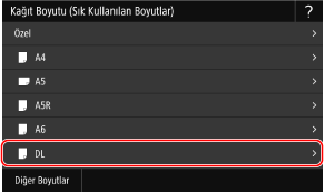 Zarflar çok amaçlı tepsiye yüklendiğinde, kağıt boyutunu seçme ayarı ekranı görüntülenir. Ayarları belirtmek için aşağıdaki adımları takip edin.